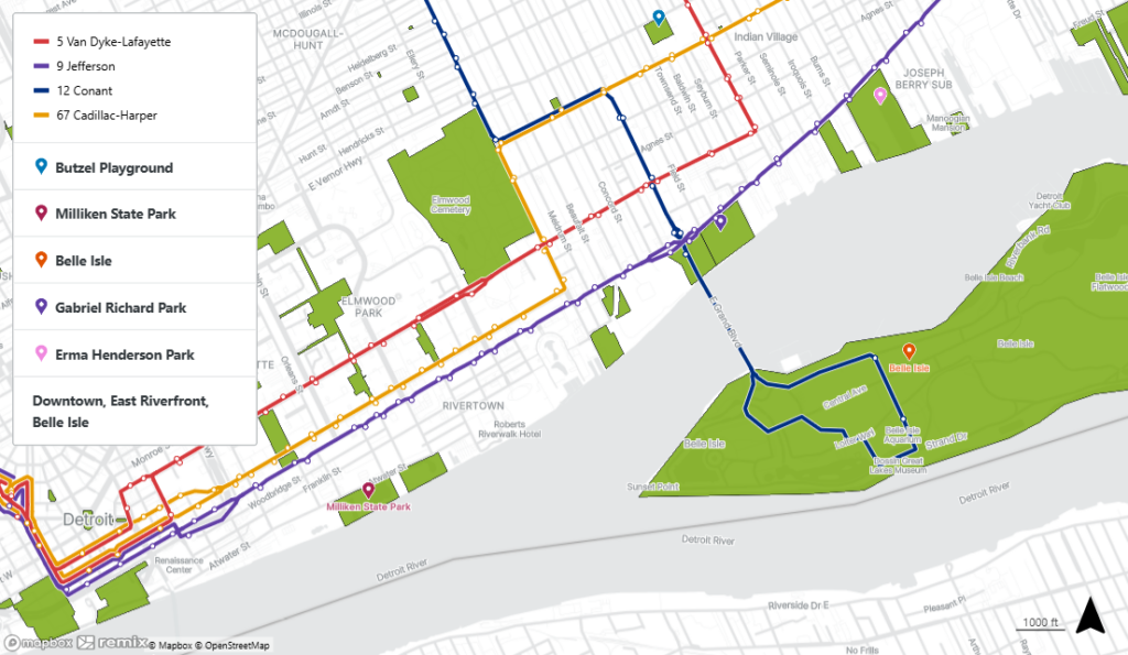 تربط وسائل النقل العام العديد من الأحياء بالحدائق، ففي ديترويت توجد حديقة بالمر، وحديقة روج، وجزيرة بيل، وممشى النهر، على سبيل المثال لا الحصر، ناهيك عن عشرات الحدائق الصغيرة المنتشرة بين الشوارع. وخاصة في هذا الوقت من العام، توفر نافذة الحافلة إطلالة رائعة على أحد أجمل المناظر في المدينة: الربيع في أوج ازدهاره.