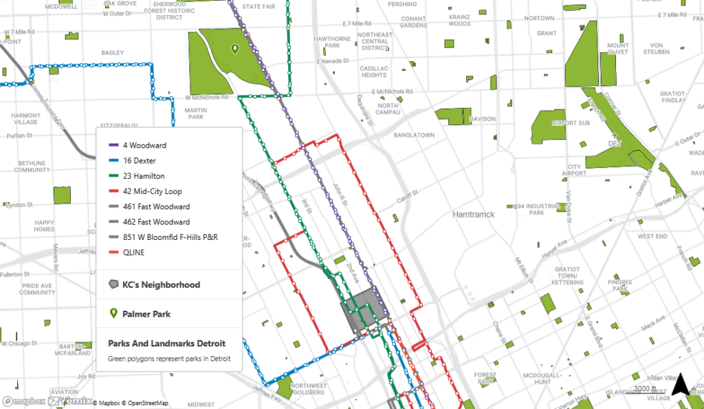 بمناسبة شهر الأرض، خططت لزيارة حديقة بالمر. كنت أبحث في خيارات المسار على تطبيق النقل، اخترت الطريق رقم 23 التابع لهيئة النقل في مقاطعة ديترويت لهذه الرحلة، والذي يتجه شمالاً على طول شارع هاميلتون من حي نيو سنتر في ديترويت.