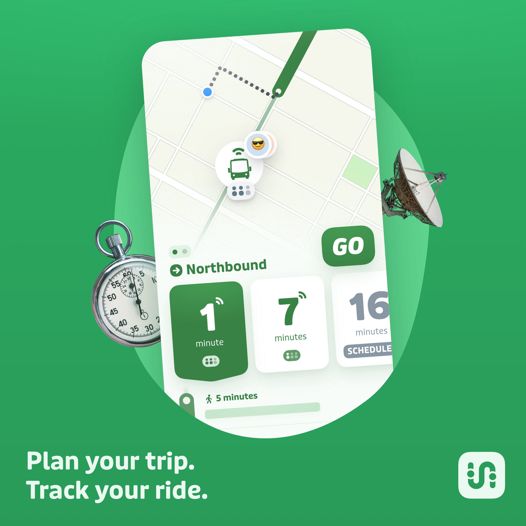 Tap “GO” to remind you when to leave, transfer, and get off the bus. Subscribe to push notifications to know when you’re almost there and when you’ve arrived.